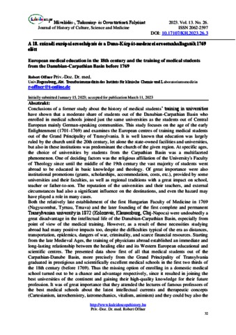Offner, Robert (2023) A 18. századi európai orvosképzés és a Duna-Kárpát-medencei orvostanhallagatók 1769 elött. KALEIDOSCOPE: MŰVELŐDÉS- TUDOMÁNY- ÉS ORVOSTÖRTÉNETI FOLYÓIRAT, 13 (26). pp. 32-66. ISSN 2062-2597