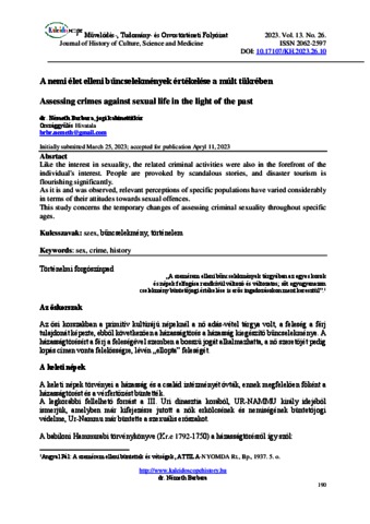 Németh, Barbara (2023) A nemi élet elleni bűncselekmények értékelése a múlt tükrében. KALEIDOSCOPE: MŰVELŐDÉS- TUDOMÁNY- ÉS ORVOSTÖRTÉNETI FOLYÓIRAT, 13 (26). pp. 190-201. ISSN 2062-2597
