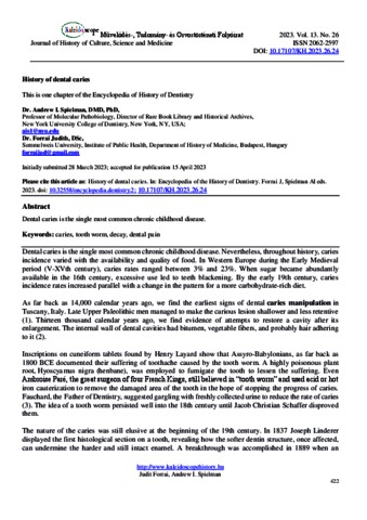 Spielman, Andrew I. and Forrai, Judit (2023) History of dental caries. KALEIDOSCOPE: MŰVELŐDÉS- TUDOMÁNY- ÉS ORVOSTÖRTÉNETI FOLYÓIRAT, 13 (26). pp. 422-424. ISSN 2062-2597