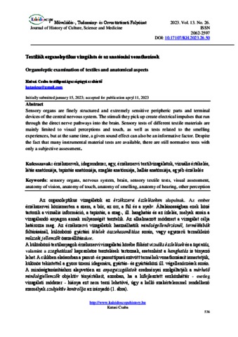 Kutasi, Csaba (2023) Textíliák organoleptikus vizsgálata és az anatómiai vonatkozások. KALEIDOSCOPE: MŰVELŐDÉS- TUDOMÁNY- ÉS ORVOSTÖRTÉNETI FOLYÓIRAT, 13 (26). pp. 536-549. ISSN 2062-2597
