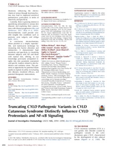 Ádám, Éva and Balázs, Leitgeb and Danis, Judit and Hajdú, Anita and Kelemen, Evelyn and Pál, Margit and Belső, Nóra and Németh, István Balázs and Neil, Rajan and Nagy, Nikoletta and Széll, Márta (2025) Truncating CYLD pathogenic variants in CYLD cutaneous syndrome distinctly influence CYLD proteostasis and NF-κB signaling. JOURNAL OF INVESTIGATIVE DERMATOLOGY, 145 (8). pp. 2094-2098. ISSN 0022-202X