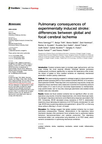 Somogyi, Petra and Tóth, Ibolya and Ballók, Bence and Hammad, Zaid and Hussein, Ramez A. and Kun-Szabó, Fruzsina and Tolnai, József and Danis, Judit and Kecskés, Szilvia and Fodor, Gergely and Farkas, Eszter and Peták, Ferenc (2024) Pulmonary consequences of experimentally induced stroke: differences between global and focal cerebral ischemia. FRONTIERS IN PHYSIOLOGY, 15. ISSN 1664-042X