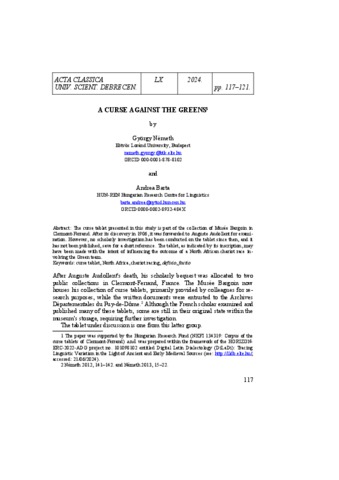 Németh, György and Barta, Andrea (2024) A Curse Against the Greens. Acta Classica Universitatis Scientiarum Debreceniensis, 60. pp. 117-121. ISSN 0418 – 453X