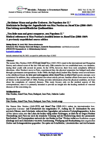 Ujvári, Hedvig (2022) „Sie kleiner Mann und großer Eroberer, Sie Napoleon der II.“ : Medizinische Bezüge der Jugendbriefe von Max Nordau an József Kiss (1866-1869) Eine bislang unveröffentlichte Quellenedition. KALEIDOSCOPE: MŰVELŐDÉS- TUDOMÁNY- ÉS ORVOSTÖRTÉNETI FOLYÓIRAT, 12 (25). pp. 76-86. ISSN 2062-2597