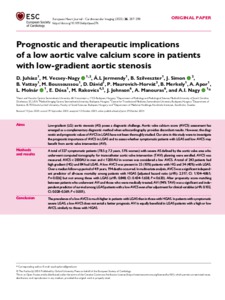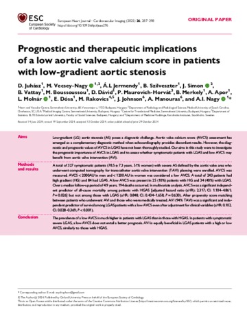 Juhász, Dénes (2024) Prognostic and therapeutic implications of a low aortic valve calcium score in patients with low-gradient aortic stenosis. EUROPEAN HEART JOURNAL - CARDIOVASCULAR IMAGING, 26. pp. 287-298. ISSN 2047-2404