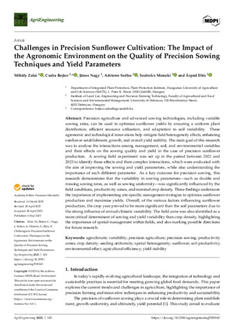 Zalai, Mihály and Bojtor, Csaba and Nagy, János and Széles, Adrienn and Monoki, Szabolcs Imre and Illés, Árpád (2025) Challenges in Precision Sunflower Cultivation: The Impact of the Agronomic Environment on the Quality of Precision Sowing Techniques and Yield Parameters. AGRIENGINEERING, 7 (5). No. 145. ISSN 2624-7402