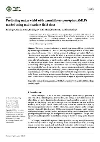 Fejér, Péter and Széles, Adrienn and Ragán, Péter and Juhász, Csaba and Horváth, Éva and Rátonyi, Tamás (2025) Predicting maize yield with a multilayer perceptron (MLP) model using multivariate field data. PRECISION CROP PRODUCTION, 1. ISSN 3094-2853