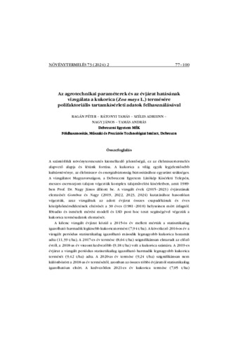 A szántóföldi növénytermesztés kiemelkedő jelentőségű, ez az élelmiszertermelés alapvető alapja és létünk forrása. A kukorica a világ egyik legjelentősebb kultúrnövénye, az élelmiszer- és energiabiztonság biztosításához egyaránt szükséges. A vizsgálatot Magyarországon, a Debreceni Egyetem Látókép Kísérleti Telepén, meszes csernozjom talajon végeztük komplex talajművelési kísérletben, amit 1989- ben Prof. Dr. Nagy János állított be. A vizsgált évek (2015–2023) évjáratának elemzését Gombos és Nagy (2019, 2022, 2023, 2024) kutatásához hasonlóan végeztük, azaz vizsgáltuk az adott évjárat összes csapadékának és éves középhőmérsékletének eltérését a 30 éves (1981–2010) helyszínen mért átlagtól. RStudio és ismételt mérési modell és LSD post hoc teszt segítségével végezük a kukorica termésadatok elemzését. A kilenc vizsgált évjárat közül a 2015-ös év mellett mértük a statisztikailag igazolható harmadik legkisebb kukoricatermést (7,94 t/ha). A következő 2016-os év a vizsgált periódus statisztikailag igazolható második legnagyobb kukorica hozamát adta (11,39 t/ha), A 2017-es év termése (8,64 t/ha) szignifikánsan elmaradt az előző évtől, a 2018-as év viszont kedvezőbb (9,18 t/ha) volt a kukorica számára. A 2019-es évjárat a vizsgált periódus statisztikailag igazolható harmadik legnagyobb kukorica termését (9,42 t/ha) adta. A 2020-as év termése (9,24 t/ha) szignifikánsan nem különbözött a 2018-as év termésétől, azonban az összes többi évjárattól statisztikailag igazolhatóan eltért. A kedvezőtlen 2021-es év kukorica termése (7,05 t/ha) statisztikailag igazolhatóan a vizsgált peridódus második legkisebb volt. A vizsgált kilenc év közül a kukorica számára legkedvezőtlenebb évjárat a 2022-es rekord aszályos év volt, ahol 2,52 t/ha termést figyeltünk meg. A következő 2023-as évjáratban mértük a vizsgált periódus legnagyobb kukorica hozamát, 11,97 t/ha-t. A legnagyobb hatást a kukorica termésére az évjárat gyakorolta 73,5%-kal, majd ezt követte a műtrágyázás 24,7%-kal. A talajművelésnek a hatása 1% volt, mert az évjárat függvényében a különböző alapművelések eltérően teljesítettek, így semlegesítették a hatást. | Field crop production is of paramount importance, the fundamental basis of food production and the source of our livelihood. Maize is one of the world's most important crops, essential for both food and energy security. The research was carried out in Hungary, at the University of Debrecen's Látókép Experimental Site, on calcareous chernozem soil in a complex tillage experiment, set up in 1989 by Prof. Dr. János Nagy. The analysis of the examined years (2015–2023) was carried out in a similar way as in the research of Gombos and Nagy (2019, 2022, 2023, 2024), i.e. we examined the deviation of the total precipitation and mean annual temperature of the given year from the 30-year (1981–2010) site average. RStudio and repeated measures model and LSD post hoc test are used to analyse the maize yield data. Of the nine years studied, 2015 was the year with the third lowest significant maize yield (7.94 t/ha). The subsequent year 2016 yielded the second highest significant maize yield of the studied period (11.39 t/ha), The 2017 yield (8.64 t/ha) was significantly lower than the preceding year, while 2018 was more favourable for maize (9.18 t/ha). The 2019 harvest produced the statistically third highest maize yield (9.42 t/ha) in the studied period. The yield of 2020 (9.24 t/ha) was not significantly different from that of 2018, but was statistically different from all other years. The yield of maize in the unfavourable year 2021 (7.05 t/ha) was statistically the second lowest in the studied period. Of the nine studied years, the most unfavourable year for maize was the record drought year of 2022, when a yield of 2.52 t/ha was observed. The following year, 2023, recorded the highest maize yield of the studied period, 11.97 t/ha. The greatest impact on maize yield was exerted by the crop year with 73.5%, followed by fertilisation with 24.7%. The effect of tillage was 1%, because the different base crops performed differently depending on the crop year, thus neutralising the effect.