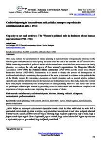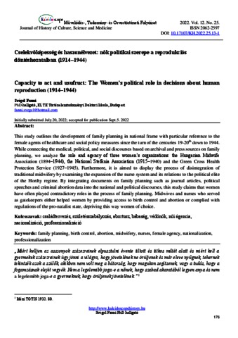 Svégel, Fanni (2022) Cselekvőképesség és haszonélvezet: nők politikai szerepe a reprodukciós döntéshozatalban (1914–1944). KALEIDOSCOPE: MŰVELŐDÉS- TUDOMÁNY- ÉS ORVOSTÖRTÉNETI FOLYÓIRAT, 12 (25). pp. 176-196. ISSN 2062-2597