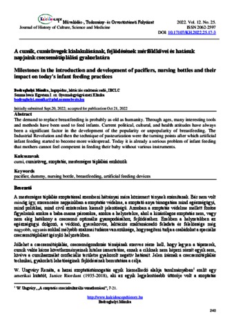 Bodroghelyi, Mónika (2022) A cumik, cumisüvegek kialakulásának, fejlődésének mérföldkövei és hatásuk napjaink csecsemőtáplálási gyakorlatára. KALEIDOSCOPE: MŰVELŐDÉS- TUDOMÁNY- ÉS ORVOSTÖRTÉNETI FOLYÓIRAT, 12 (25). pp. 240-248. ISSN 2062-2597