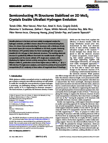 Ollár, Tamás and Vancsó, Péter and Kun, Péter and Koós, Antal Adolf and Dobrik, Gergely and Sukhanova, EV and Popov, ZI and Németh, Miklós László and Frey, Krisztina and Pécz, Béla and Nemes Incze, Péter and Hwang, C and Pap, József Sándor and Tapasztó, Levente (2025) Semiconducting Pt Structures Stabilized on 2D MoS2 Crystals Enable Ultrafast Hydrogen Evolution. ADVANCED MATERIALS, in pre. ISSN 0935-9648
