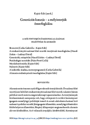 Kajtár, Edit (2025) Generációs kutatás : a mélyinterjúk összefoglalása. In: Generációkutatás a kormányzati igazgatásban. Ludovika Egyetemi Kiadó, Budapest, pp. 231-271. ISBN 9789636531966; 9789636531973