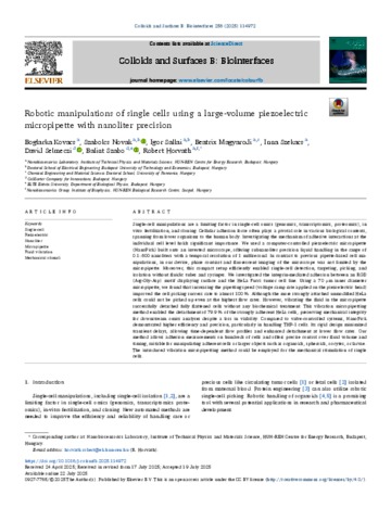Kovács, Boglárka and Novák, Szabolcs and Sallai, Igor and Magyaródi, Beatrix and Székács, Inna and Selmeczi, David and Szabó, Bálint and Horváth, Róbert (2025) Robotic manipulations of single cells using a large-volume piezoelectric micropipette with nanoliter precision. COLLOIDS AND SURFACES B: BIOINTERFACES, 256. No.-114972. ISSN 0927-7765 (In Press)