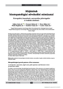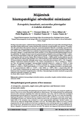 Jelenlegi ismereteink alapján a májáttétek hisztopatológiai növekedési mintázatai prognosztikai jelentőséggel bírnak, ugyanakkor klinikai alkalmazásuk, terápiás döntéshozatalt befolyásoló szerepük egyelőre nem tisztázott. A rendelke- zésre álló szakirodalom túlnyomórészt colorectalis carcinomák májáttéteire fókuszál, és mindeddig csupán két közle- mény foglalkozott a hisztopatológiai növekedési mintázat analízisével konszekutív eseteket tartalmazó betegkohorsz- ban. Célunk a 2011 és 2016 közötti összes májáttétes beteg hisztopatológiai növekedési mintázatának vizsgálata volt konszekutív jelleggel. A vizsgált időtartamba került eseteknél az orvosi dokumentációból klinikopatológiai tényező- ket gyűjtöttünk. Az áttétek szövettani metszeteit gastrointestinalis patológiában jártas patológus értékelte. A statisz- tikai elemzést Kruskal–Wallis és Fisher-féle egzakt próbával végeztük. A progressziómentes túlélés, a teljes túlélés és a progresszióig eltelt idő becslése Kaplan–Meier-módszerrel történt, a túlélési görbék összehasonlítására log-rank tesztet alkalmaztunk. Minden próba kétoldalas volt, a 0,05-nél kisebb p-értéket tekintettük szignifikánsnak. Összesen 41 beteg eredményeit elemeztük, többségük primer tumora colorectalis adenocarcinoma volt (n = 32). A leggyako- ribbnak a ’replacement’ mintázat bizonyult (n = 22), amelyet a desmoplasticus (n = 15) és a ’pushing’ (n = 4) köve- tett. Nem volt statisztikai összefüggés a hisztopatológiai növekedési mintázat és a stádium (p = 0,105), az áttéti fokalitás (p = 0,898), a legnagyobb primer (p = 0,316) és szekunder (p = 0,441) tumorátmérő, a kimetszés komp- lettsége (p = 0,492) és a vénás terjedés jelenléte (p = 1) között. Nem volt szignifikáns korreláció a növekedési mintá- zat és a progressziómentes túlélés (p = 0,417), a teljes túlélés (p = 0,297), illetve a progresszióig eltelt idő (p = 0,267) között. Eredményeink arra utalnak, hogy a hisztopatológiai növekedési mintázatok prognosztikai értéke korlátozott lehet konszekutív betegkohorszban. A jövőben a hisztopatológiai növekedési mintázatok prognosztikai értékének részletesebb vizsgálatára van szükség. | According to current knowledge, histopathological growth patterns of liver metastases carry prognostic significance; however, they do not yet have therapeutic implications in clinical practice. The existing literature has predominantly focused on liver metastases originating from colorectal carcinomas, and to date, only two studies have investigated histopathological growth patterns in consecutively collected patient cohorts. Our aim was to study the histopatho- logical growth patterns of all patients with liver metastases between 2011 and 2016 in a consecutive manner. Clin- icopathological features were extracted from the medical records of the cases included in the study period. Histo- logical slides of the metastases were evaluated by an expert gastrointestinal pathologist. Statistical analyses were carried out by using the Kruskal–Wallis and Fisher’s exact test. The Kaplan–Meier method was used to estimate progression-free survival, overall survival and time-to-progression curves, and the log-rank test was applied to com- pare survival curves. All statistical tests were two-sided, and p-values less than 0.05 were considered statistically sig- nificant. Altogether 41 patients were included in our study. The majority were diagnosed with colorectal adenocarcinoma primary tumor (n = 32). Replacement pattern proved to be the most common (n = 22), followed by desmoplastic (n = 15), and pushing (n = 4). There was no significant association found between histopathological growth patterns and stage (p = 0.105), secondary tumour focality (p = 0.898), largest diameter primary (p = 0.316) and secondary carcinoma (p = 0.441), completeness of resection (p = 0.492), and the presence of venous spread (p = 1). There were no significant results found between histopathological growth patterns and progression-free survival (p = 0.417), overall survival (p = 0.297), and time-to-progression (p = 0.267). Our results suggest that the prognostic value of histopathological growth patterns may be limited in a consecutively collected patient cohort. Further studies regarding the prognostic utility of histopathological growth patterns have to be carried out in the future.