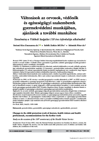 Soósné Kiss, Zsuzsanna and Sebők, Zoltán and Schmidt, Péter (2025) Változások az orvosok, védőnők és egészségügyi szakemberek gyermekvédelmi munkájában, ajánlások a további munkához : Tanulmány a Védőnői Szolgálat 110 éves évfordulója alkalmából = Changes in the child protection work of doctors, health visitors and health professionals, recommendations for the further work : Study on the occasion of the 110th anniversary of the Health Visitor Service. ORVOSI HETILAP, 166 (35). pp. 1391-1400. ISSN 0030-6002