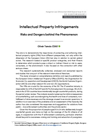 Csiki, Olivér Tamás (2025) Intellectual Property Infringements : Risks and Dangers behind the Phenomenon. MAGYAR RENDÉSZET, 25 (Különs). pp. 13-32. ISSN 1586-2895