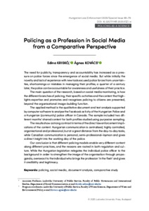 The need for publicity, transparency and accountability has increased as a pressure on police forces since the emergence of social media. But while initially the novelty and lack of experience with new tools excused police forces from uncertainties, shortcomings or mistakes in managing their profiles, a quarter of a century later, the police can be accountable for awareness and usefulness of their practice.The main question of the research, based on social media monitoring, is how the different branches of policing, their specific activities and the content that highlights expertise and promotes and recognises policing to citizens are presented, beyond the organisational image-building function.The applied method is the qualitative document and text analysis supported by computer software to analyse the Facebook activity of the Hungarian Police and a Hungarian (community) police officer in Canada. The sample included two different months’ shared content for both profiles studied using purposive sampling.The results show a strong contrast in terms of the direct law enforcement implications of the content. Hungarian communication is centralised, highly controlled, organisational and professional, but at a great distance from the day-to-day tasks, while Canadian communication is personal, semi-professional-layman and gives a direct insight into the working day of the police.Our conclusion is that different policing models enable very different content along different practices, and the reasons are rooted in both regulation and culture. While the Hungarian legislation relegates the individual police officer to the background in order to strengthen the image of the organisation through propaganda, overseas it is the individual who brings the profession ‘in the flesh’ and gives it credibility and legitimacy.
