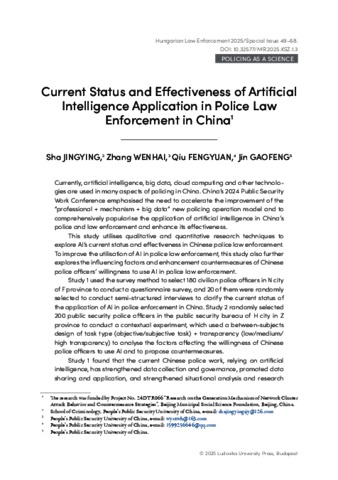 Sha, Jingying and Zhang, Wenhai and Qiu, Fengyuan and Jin, Gaofeng (2025) Current Status and Effectiveness of Artificial Intelligence Application in Police Law Enforcement in China. MAGYAR RENDÉSZET, 25 (Különs). pp. 49-68. ISSN 1586-2895