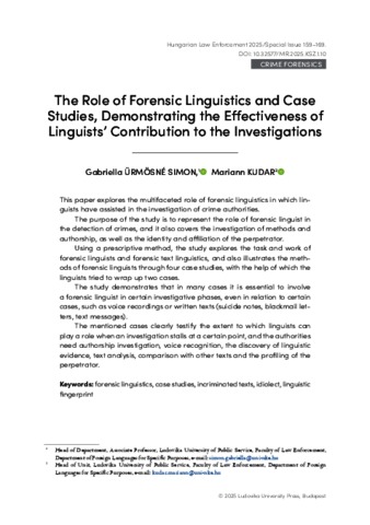 Ürmösné Simon, Gabriella and Kudar, Mariann (2025) The Role of Forensic Linguistics and Case Studies, Demonstrating the Effectiveness of Linguists’ Contribution to the Investigations. MAGYAR RENDÉSZET, 25 (Különs). pp. 159-169. ISSN 1586-2895