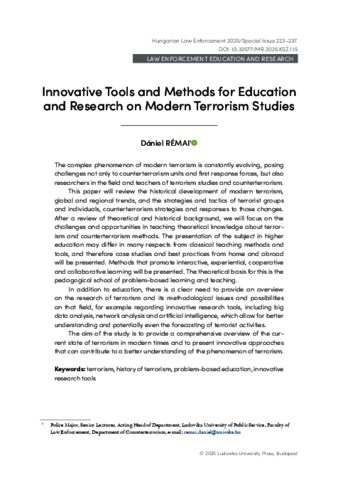 Rémai, Dániel (2025) Innovative Tools and Methods for Education and Research on Modern Terrorism Studies. MAGYAR RENDÉSZET, 25 (Különs). pp. 223-237. ISSN 1586-2895