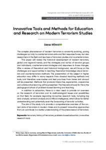 The complex phenomenon of modern terrorism is constantly evolving, posing challenges not only to counterterrorism units and first response forces, but also researchers in the field and teachers of terrorism studies and counterterrorism.This paper will review the historical development of modern terrorism, global and regional trends, and the strategies and tactics of terrorist groups and individuals, counterterrorism strategies and responses to those changes. After a review of theoretical and historical background, we will focus on the challenges and opportunities in teaching theoretical knowledge about terrorism and counterterrorism methods. The presentation of the subject in higher education may differ in many respects from classical teaching methods and tools, and therefore case studies and best practices from home and abroad will be presented. Methods that promote interactive, experiential, cooperative and collaborative learning will be presented. The theoretical basis for this is the pedagogical school of problem-based learning and teaching.In addition to education, there is a clear need to provide an overview on the research of terrorism and its methodological issues and possibilities on that field, for example regarding innovative research tools, including big data analysis, network analysis and artificial intelligence, which allow for better understanding and potentially even the forecasting of terrorist activities.The aim of the study is to provide a comprehensive overview of the current state of terrorism in modern times and to present innovative approaches that can contribute to a better understanding of the phenomenon of terrorism.