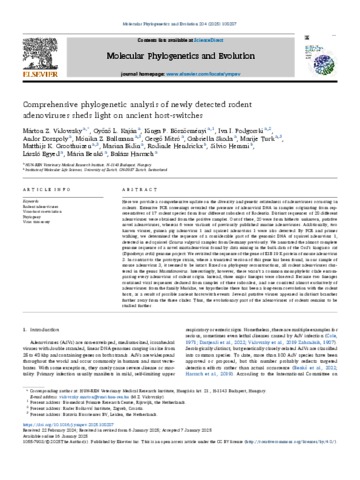 Vidovszky, Márton and Kaján, Győző László and Böszörményi, Kinga P. and Podgorski, Iva I. and Doszpoly, Andor and Ballmann, Mónika Z. and Mitró, Gergő and Skoda, Gabriella and Turk, Marije and Groothuizen, Matthijs K. and Bidin, Marina and Hendrickx, Rodinde and Hemmi, Silvio and Egyed, László and Benkő, Mária and Harrach, Balázs (2025) Comprehensive phylogenetic analysis of newly detected rodent adenoviruses sheds light on ancient host-switches. MOLECULAR PHYLOGENETICS AND EVOLUTION, 204. No.-108287. ISSN 1055-7903