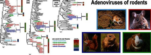 Here we provide a comprehensive update on the diversity and genetic relatedness of adenoviruses occurring in rodents. Extensive PCR screenings revealed the presence of adenoviral DNA in samples originating from representatives of 17 rodent species from four different suborders of Rodentia. Distinct sequences of 28 different adenoviruses were obtained from the positive samples. Out of these, 20 were from hitherto unknown, putative novel adenoviruses, whereas 6 were variants of previously published murine adenoviruses. Additionally, two known viruses, guinea pig adenovirus 1 and squirrel adenovirus 1 were also detected. By PCR and primer walking, we determined the sequence of a considerable part of the genomic DNA of squirrel adenovirus 1, detected in red squirrel (Sciurus vulgaris) samples from Germany previously. We annotated the almost complete genome sequence of a novel mastadenovirus found by data mining in the bulk data of the Ord’s kangaroo rat (Dipodomys ordii) genome project. We revisited the sequence of the gene of E1B 19 K protein of mouse adenovirus 3. In contrast to the prototype strain, where a truncated version of this gene has been found, in our sample of mouse adenovirus 3, it seemed to be intact. Based on phylogeny reconstructions, all rodent adenoviruses clustered in the genus Mastadenovirus. Interestingly, however, there wasn’t a common monophyletic clade encompassing every adenovirus of rodent origin. Instead, three major lineages were observed. Because two lineages contained viral sequences deduced from samples of three suborders, and one consisted almost exclusively of adenoviruses from the family Muridae, we hypothesize there has been a long-term coevolution with the rodent hosts, as a result of possible ancient host-switch events. Several putative viruses appeared in distinct branches further away from the three clades. Thus, the evolutionary past of the adenoviruses of rodents remains to be studied further.