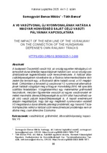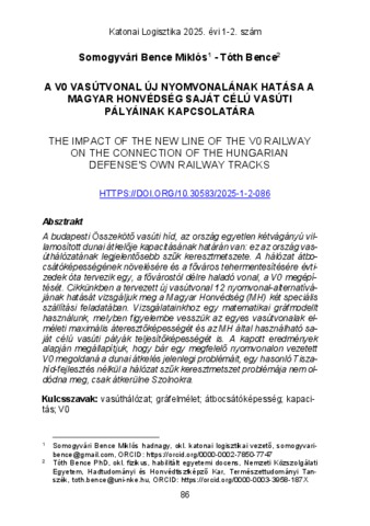 Somogyvári, Bence Miklós and Tóth, Bence (2025) A V0 vasútvonal új nyomvonalának hatása a Magyar Honvédség saját célú vasúti pályáinak kapcsolatára = The impact of the new line of the v0 railway on the connection of the hungarian defense's own railway tracks. KATONAI LOGISZTIKA, 33 (1-2). pp. 86-110. ISSN 1588-4228