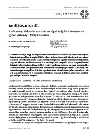 Gregersen-Labossa, György (2025) Szemlélődés az ikon előtt : A mindennapi diakóniától az asztaloknál végzett szolgálaton át a szervezett egyházi diakóniáig : teológiai mozaikok = Contemplation in front of the Icon : From Everyday Diaconia to Table Service to Organised Church to Organized Diaconia : Theological Mosaics. LELKIPÁSZTOR, 100 (5). pp. 243-250. ISSN 0133-2821