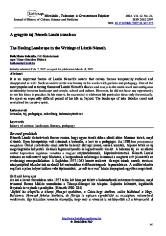 Both, Mária Gabriella (2022) A gyógyító táj Németh László írásaiban. KALEIDOSCOPE: MŰVELŐDÉS- TUDOMÁNY- ÉS ORVOSTÖRTÉNETI FOLYÓIRAT, 12 (24). pp. 367-372. ISSN 2062-2597