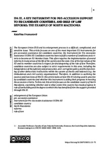 The European Union (EU) and its enlargement process is a difficult, complicated, and sensitive issue. This article focuses on one of the most important EU instruments for pre-accession assistance for candidate countries: the Instrument for Pre-Accession Assistance III (IPA III). Candidate countries have to fulfil a number of conditions and criteria to become an EU Member State. This often requires the implementation of several reforms in many areas of the life of the society and the state. One of the key values of the EU and its member countries is respect for and deepening of the rule of law. Therefore, candidate countries are also subject to strict requirements in this area, including the independence of the judiciary and prosecution, anti-corruption policy, and the functioning of other democratic institutions within the system of checks and balances (e.g. the Ombudsman and civil society organisations). Therefore, in addition to outlining the essence and functions of IPA III, this article looks at how IPA III is being used in practice by candidate countries and whether this instrument is aiding their progress in meeting the accession criteria. To this end, this article focuses on the candidate country of North Macedonia, examining whether and to what extent this country has made progress in rule of law building and the degree to which this has benefited from the support provided through IPA III.