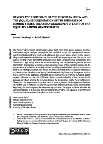 Trócsányi, László and Sándor, Lénárd (2025) Democratic Legitimacy of the European Union and the (Equal) Representation of the Interests of Member States. LAW IDENTITY AND VALUES, 5 (1). pp. 239-253. ISSN 2786-2542