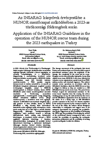 A 2023. február 6-án Törökországot és Északnyugat-Szíriát megrázó földrengés kárfelszámolása nemzetközi segítséget igényelt, tekintettel a káreset nagyságára, az esemény bonyolultságára, és a kiterjedésére. Magyarország a nemzetközileg bevethető, nehéz kategóriás hivatalos mentőcsapatát, a HUNOR-t küldte a helyszínre, majd őket követték önkéntes mentőszervezetek, a TEK speciális csapatai, katonaorvosok és statikus mérnökök is. A szerzők az INSARAG Irányelvek előírásainak megfelelő mentési tevékenységet vizsgálják, melyet a HUNOR mentőcsapatnak is kötelező betartani, hiszen ENSZ INSARAG nehéz kutató mentőcsapatként szereztek minősítést. A Törökország nemzetközi segítségkérésétől, a mentőcsapatok ország elhagyásáig felölelő időszakban felállított ad-hoc jellegű munkacsoportok, a mentésben részt vevő egységek, valamint az INSARAG szervezetének vizsgálata adja a cikk gerincét. A téma aktuális, hiszen az ENSZ INSARAG a világ bármely táján bekövetkező katasztrófa esetén segítséget nyújt, amennyiben a bajba jutott ország kéri azt. A cikk végén a szerzők kitérnek Magyarország földrengés veszélyeztetettségének vizsgálatára, majd javaslatot tesznek a lakosság felkészítésének újabb, ezidáig még kiaknázatlan lehetőségeire. A javaslatok között szerepel a VÉSZ applikáció fejlesztési lehetősége, a hivatásos katasztrófavédelem honlapjának új modullal történő fejlesztésének lehetősége, a tájékoztató kiadványok földrengés témában történő bővítési lehetősége, valamint gyermekek számára zsebre tehető földrengési kisokos létrehozásának lehetősége. | The damage assessment of the earthquake that struck Turkey and northwest Syria on 6 February 2023 required international assistance, given the magnitude of the damage, the complexity of the event and its scope. Hungary sent its internationally deployable, heavy-duty official rescue team, HUNOR, to the scene, followed by volunteer rescue organisations, special teams from TEK, military medics and structural engineers. The authors examine rescue operations in accordance with the INSARAG Guidelines, which the HUNOR rescue team is obliged to follow, as they are certified as a UN INSARAG heavy search rescue team. The period from Turkey's request for international assistance to the rescue teams' departure from the country, the ad-hoc working groups set up, the units involved in the rescue and the INSARAG organisation form the backbone of the article. It is a timely topic, as UN INSARAG provides assistance in the event of a disaster anywhere in the world, if requested by the country in distress. At the end of the article, the authors discuss Hungary's vulnerability to earthquakes and suggest new, as yet untapped opportunities for preparing the population. Among the suggestions are the possibility of developing the VÉSZ app, the possibility of developing the website of the professional disaster management with a new module, the possibility of expanding the earthquake information publications and the possibility of creating a pocket earthquake booklet for children.