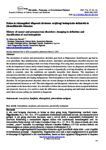 Bukovszky, Botond (2022) Rákos és rákmegelőző állapotok története: szájüregi leukoplakia definíciók és klasszifikációk változása. KALEIDOSCOPE: MŰVELŐDÉS- TUDOMÁNY- ÉS ORVOSTÖRTÉNETI FOLYÓIRAT, 12 (24). pp. 245-254. ISSN 2062-2597