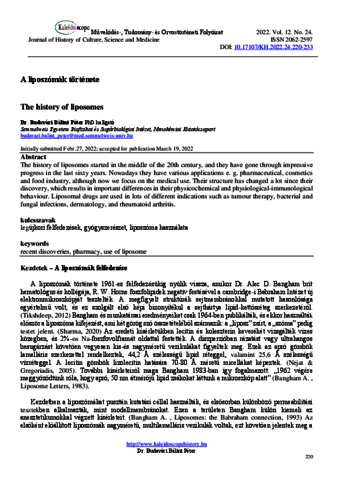 Budavári, Bálint Péter (2022) A liposzómák története. KALEIDOSCOPE: MŰVELŐDÉS- TUDOMÁNY- ÉS ORVOSTÖRTÉNETI FOLYÓIRAT, 12 (24). pp. 220-233. ISSN 2062-2597