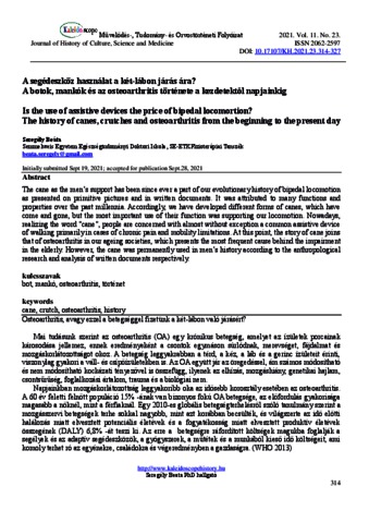 Seregély, Beáta (2021) A segédeszköz használat a két-lábon járás ára? A botok, mankók és az osteoarthritis története a kezdetektől napjainkig. KALEIDOSCOPE: MŰVELŐDÉS- TUDOMÁNY- ÉS ORVOSTÖRTÉNETI FOLYÓIRAT, 11 (23). pp. 314-327. ISSN 2062-2597