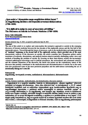 Kovács, Janka (2021) „Igen nehéz a’ bizonytalan maga-megölésben ítéletet hozni.” Az öngyilkosság kérdése a törvényszéki orvostani diskurzusban (1780–1850). KALEIDOSCOPE: MŰVELŐDÉS- TUDOMÁNY- ÉS ORVOSTÖRTÉNETI FOLYÓIRAT, 11 (23). pp. 66-85. ISSN 2062-2597