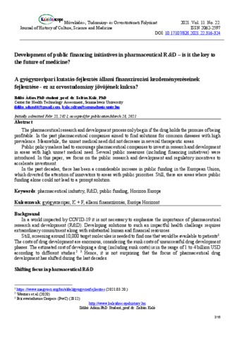 Ádám, Ildikó and Kaló, Zoltán (2021) Development of public financing initiatives in pharmaceutical R&D – is it the key to the future of medicine? KALEIDOSCOPE: MŰVELŐDÉS- TUDOMÁNY- ÉS ORVOSTÖRTÉNETI FOLYÓIRAT, 11 (22). pp. 316-324. ISSN 2062-2597