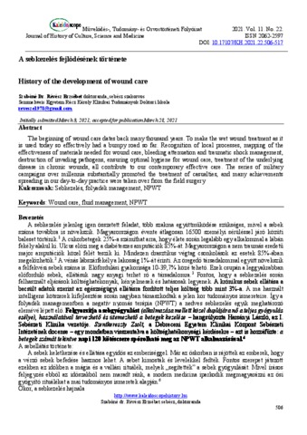 Szabóné Révész, Erzsébet (2021) A sebkezelés fejlődésének története. KALEIDOSCOPE: MŰVELŐDÉS- TUDOMÁNY- ÉS ORVOSTÖRTÉNETI FOLYÓIRAT, 11 (22). pp. 506-517. ISSN 2062-2597