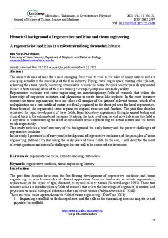 Varga, Rita (2021) Historical background of regenerative medicine and tissue engineering. KALEIDOSCOPE: MŰVELŐDÉS- TUDOMÁNY- ÉS ORVOSTÖRTÉNETI FOLYÓIRAT, 11 (22). pp. 73-80. ISSN 2062-2597