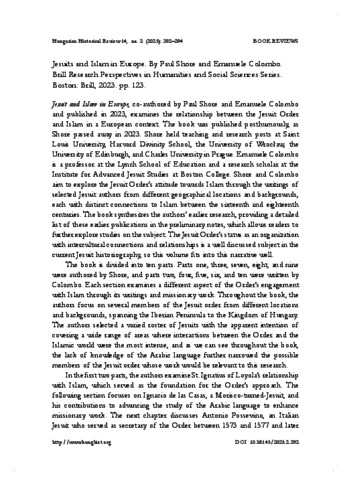 Lédig, Dávid (2025) Jesuits and Islam in Europe. By Paul Shore and Emanuele Colombo. Brill Research Perspectives in Humanities and Social Sciences Series. Boston: Brill, 2023. pp. 123. HUNGARIAN HISTORICAL REVIEW: NEW SERIES OF ACTA HISTORICA ACADEMIAE SCIENTIARIUM HUNGARICAE, 14 (2). pp. 292-294. ISSN 2063-8647