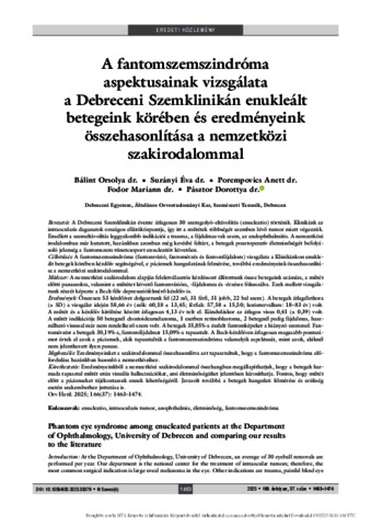 Bálint, Orsolya and Surányi, Éva and Porempovics, Anett and Fodor, Mariann and Pásztor, Dorottya (2025) A fantomszemszindróma aspektusainak vizsgálata a Debreceni Szemklinikán enukleált betegeink körében és eredményeink összehasonlítása a nemzetközi szakirodalommal = Phantom eye syndrome among enucleated patients at the Department of Ophthalmology, University of Debrecen and comparing our results to the literature. ORVOSI HETILAP, 166 (37). pp. 1463-1474. ISSN 0030-6002