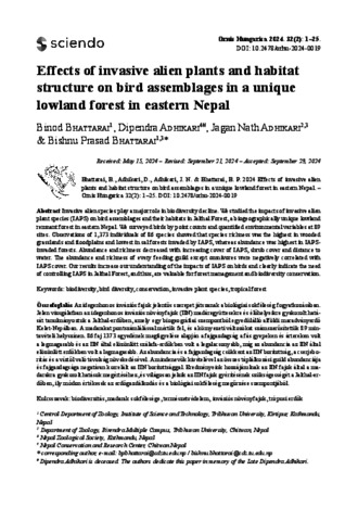 Bhattarai, Binod and Adhikari, Dipendra and Adhikari, Jagan Nath and Bhattarai, Bishnu Prasad (2024) Effects of invasive alien plants and habitat structure on bird assemblages in a unique lowland forest in eastern Nepal. ORNIS HUNGARICA, 32 (2). pp. 1-25. ISSN 1215-1610