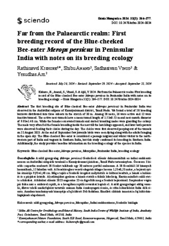 Kishore, Rathinavel and Anand, Shibu and Vinod, Sadhasivan and Ajil, Yesudhas (2024) Far from the Palaearctic realm: First breeding record of the Blue-cheeked Bee-eater Merops persicus in Peninsular India with notes on its breeding ecology. ORNIS HUNGARICA, 32 (2). pp. 264-277. ISSN 1215-1610