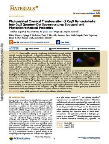 Kovács, Dávid and Radnóczi, György Zoltán and Horváth, Zsolt Endre and Frey, Krisztina and Sulyok, Attila and Fogarassy, Zsolt and Pap, József S. and Deák, András and Zámbó, Dániel (2025) Photoassisted Chemical Transformation of Cu2O Nanooctahedra into Cu2S Quantum-Dot Superstructures: Structural and Photoelectrochemical Properties. ACS MATERIALS AU. ISSN 2694-2461 (In Press)
