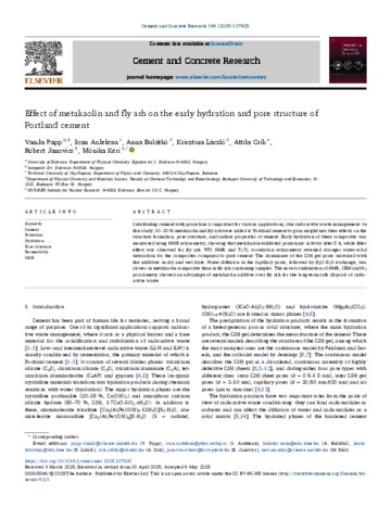 Papp, Vanda and Ardelean, Ioan and Bulátkó, Anna and László, Krisztina and Csik, Attila and Janovics, Róbert and Kéri, Mónika (2025) Effect of metakaolin and fly ash on the early hydration and pore structure of Portland cement. CEMENT AND CONCRETE RESEARCH, 196. No.-107928. ISSN 0008-8846
