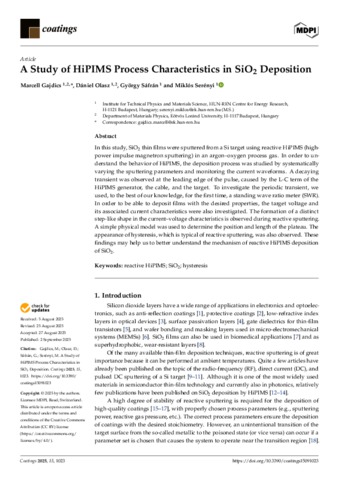 Gajdics, Marcell and Olasz, Dániel and Sáfrán, György and Serényi, Miklós (2025) A Study of HiPIMS Process Characteristics in SiO2 Deposition. COATINGS, 15 (9). No.-1023. ISSN 2079-6412
