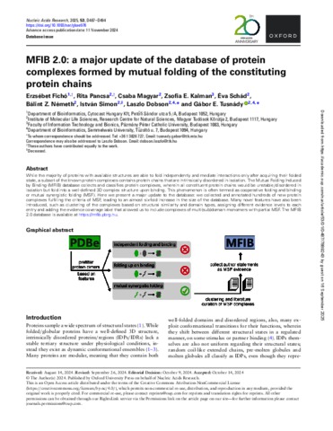 Fichó, Erzsébet and Pancsa, Rita and Magyar, Csaba and Kálmán, Zsófia Etelka and Schád, Éva and Németh, Zoltán Bálint and Simon, István and Dobson, László and Tusnády, Gábor (2025) MFIB 2.0: a major update of the database of protein complexes formed by mutual folding of the constituting protein chains. NUCLEIC ACIDS RESEARCH, 53 (D1). D487-D494. ISSN 0305-1048
