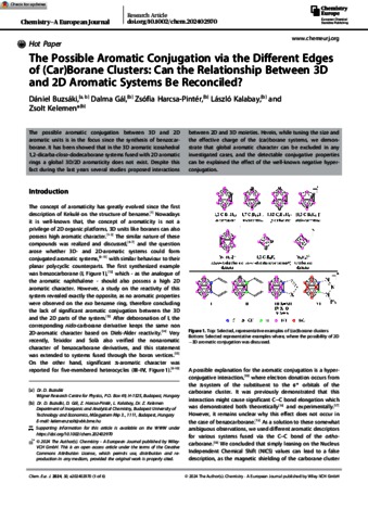 Buzsáki, Dániel and Gál, Dalma and Harcsa‐Pintér, Zsófia and Kalabay, László and Kelemen, Zsolt (2024) The Possible Aromatic Conjugation via the Different Edges of (Car)Borane Clusters: Can the Relationship Between 3D and 2D Aromatic Systems Be Reconciled? CHEMISTRY – A EUROPEAN JOURNAL, 30 (61). No.-e202402970. ISSN 0947-6539
