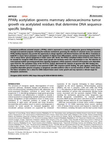 Tian, Lifeng and Jiao, Xuanmao and Wang, Chenguang and Li, Danni and Ertel, Adam and Achinger-Kawecka, Joanna and Addya, Sankar and Soccio, Raymond E. and Chen, Eric R. and Győrffy, Balázs and Di, Sante Gabriele and Zhong, Zhijiu and Alkhafaji, Haidar and Entcheva, Nina and Campbell, Elyssa M. and McCue, Peter A. and Kossenkov, Andrew V. and Pancsa, Rita and Tompa, Péter and Clark, Susan and Pestell, Richard George (2025) PPARγ acetylation governs mammary adenocarcinoma tumor growth via acetylated residues that determine DNA sequence-specific binding. ONCOGENE, 44. pp. 3476-3492. ISSN 0950-9232